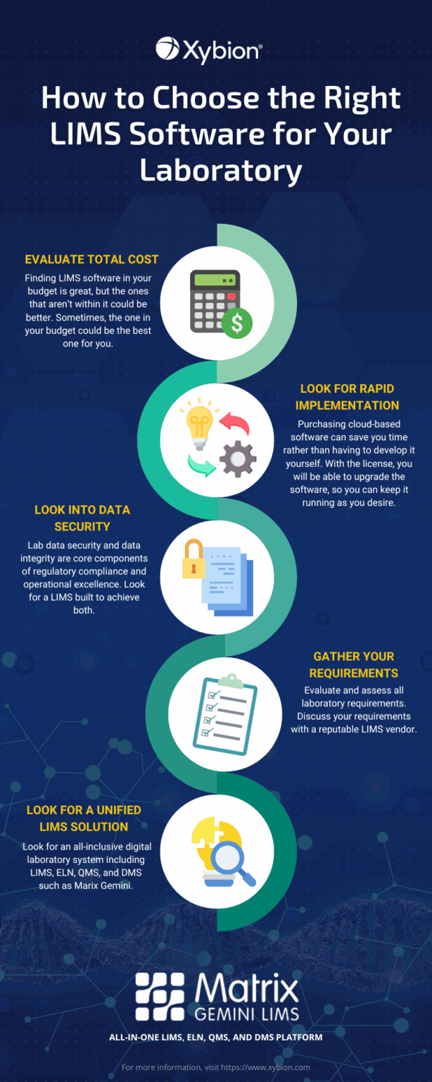 Look for an all-in-one digital laboratory management software that can help you keep things in one place and have access to more software than just LIMS. At Xybion, our digital unified lab operations with cloud-based LIMS, Quality Management, and ELN enables your lab to be competitive and efficient in the next generation of digital lab management.
