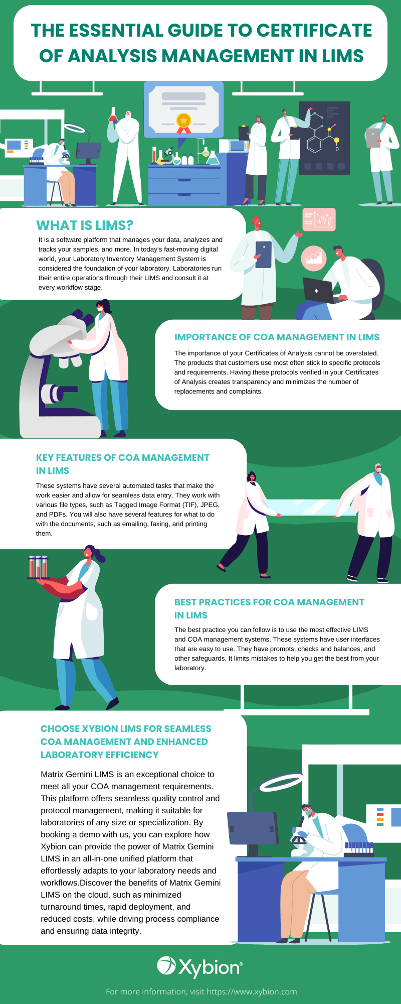 Matrix Gemini LIMS is an exceptional choice to meet all your COA management requirements. This platform offers seamless quality control and protocol management, making it suitable for laboratories of any size or specialization. By booking a demo with us, you can explore how Xybion can provide the power of Matrix Gemini LIMS in an all-in-one unified platform that effortlessly adapts to your laboratory needs and workflows.